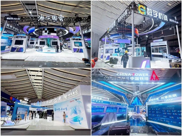 慧展科技公司為多家單位提供展臺策劃設(shè)計、施工搭建及運(yùn)營保障一體化服務(wù),涉及展臺面積約 750㎡。中國電信展臺延續(xù)“無桁架”綠色搭建概念,將環(huán)保理念貫徹到底;鐵塔展臺通過數(shù)字化手段以3D模式呈現(xiàn)“數(shù)智鐵塔”;浙江國資與杭鋼展臺通過頂部動態(tài)LED屏實(shí)現(xiàn)展臺聯(lián)動,生動詮釋 “星河之力,雙核共生”的創(chuàng)意理念。