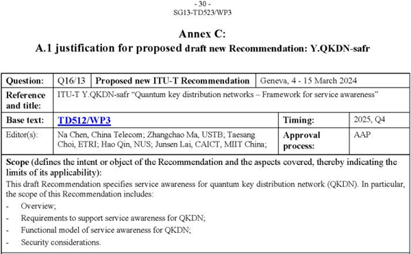 ◎我國(guó)量子通信國(guó)際標(biāo)準(zhǔn)立項(xiàng)取得新突破。3月4日至15日,國(guó)際電信聯(lián)盟電信標(biāo)準(zhǔn)部門第13研究組(ITU-T SG13)全體會(huì)議在日內(nèi)瓦召開。由中國(guó)電信研究院牽頭的國(guó)際標(biāo)準(zhǔn)立項(xiàng)提案ITU-T Y.QKDN-safr“Quantum key distribution networks–Framework for service awareness”(量子密鑰分發(fā)網(wǎng)絡(luò)——服務(wù)感知框架)獲批新立項(xiàng)。中國(guó)電信研究院與中國(guó)信通院等單位聯(lián)合牽頭的國(guó)際標(biāo)準(zhǔn)立項(xiàng)提案獲批新立項(xiàng)。這是繼中國(guó)電信代表央企首次推動(dòng)量子通信國(guó)際標(biāo)準(zhǔn)化后又一重大突破。