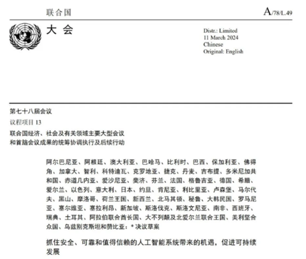 ◎聯(lián)合國(guó)通過(guò)關(guān)于人工智能的首個(gè)決議。3月21日,聯(lián)合國(guó)大會(huì)通過(guò)首個(gè)關(guān)于人工智能的全球決議《抓住安全、可靠和值得信賴的人工智能系統(tǒng)帶來(lái)的機(jī)遇,促進(jìn)可持續(xù)發(fā)展》。這是聯(lián)合國(guó)大會(huì)首次就監(jiān)管人工智能這一新興領(lǐng)域通過(guò)決議。決議草案由美國(guó)提交,同時(shí)還有120多個(gè)會(huì)員國(guó)成為“共同提案國(guó)”或表達(dá)支持。