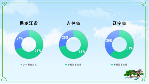 東北三省接待游客中有67.51%的游客選擇了鄉(xiāng)村游,其中吉林省的游客鄉(xiāng)村游比例最高達到了72.3%,吉林鄉(xiāng)村的美麗雪景和熱鬧的生活氣息吸引著來自全國四面八方的游客。