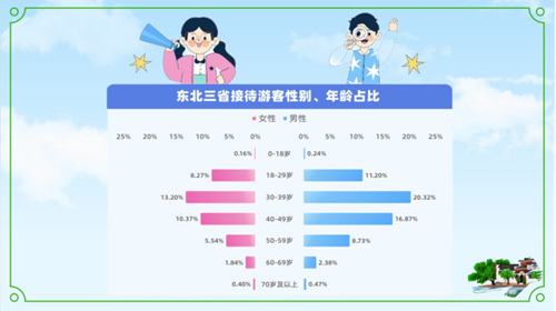 接待游客中首次到訪東北三省的游客占比32.72%,每3個人中就有1個是被冰雪游吸引而首次踏上這片東北大地。游客中男性群體居多,占比達59.97%,其中主力旅游人群是30歲至39歲之間的男性群體。