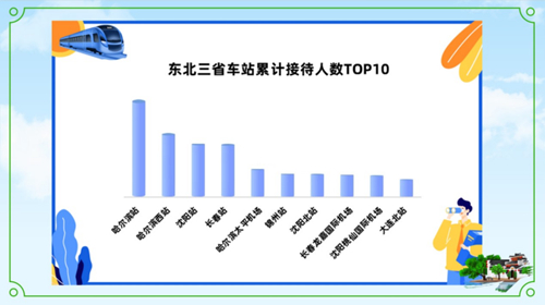 從東北三省車站累計到訪人數(shù)來看,哈爾濱站累計接待人數(shù)最高,其次是哈爾濱西站和沈陽站。繼“爾濱”出圈后,沈陽和長春正在成為大眾選擇冰雪游的新打卡地。