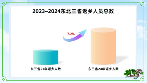 2024年春節(jié)期間,東北三省返鄉(xiāng)人數(shù)達到了近3年的最高峰,對比23年春節(jié)增長了7.2%。這不僅反映了返鄉(xiāng)大軍的規(guī)模,也促進了地方特色美食和冰雪文化活動的發(fā)展,為鄉(xiāng)村經(jīng)濟和文化的振興提供了動力。