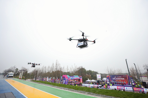 賽中,團(tuán)隊采用無人機“空地協(xié)同”保障方案,提供空中巡查、應(yīng)急救援、醫(yī)療運輸?shù)饶芰Γ哼\用無人運輸機進(jìn)行醫(yī)療藥品運轉(zhuǎn)流程,并進(jìn)行AED等醫(yī)療物資投放;在賽事后段設(shè)置無人機懸停點對賽事人員安全進(jìn)行保障,協(xié)助構(gòu)建起多維度、立體化、全時空的賽事安全保障服務(wù)體系。