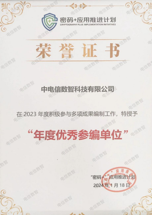 中電信數(shù)智科技有限公司作為中國電信密碼應(yīng)用推進(jìn)工作的“主力軍”,積極響應(yīng)CPII各項工作,參與了《密碼服務(wù)成熟度模型》《WEB3.0數(shù)字身份密碼安全體系研究報告》等多項標(biāo)準(zhǔn)和研究報告的編制,獲得2023年優(yōu)秀參編單位稱號。