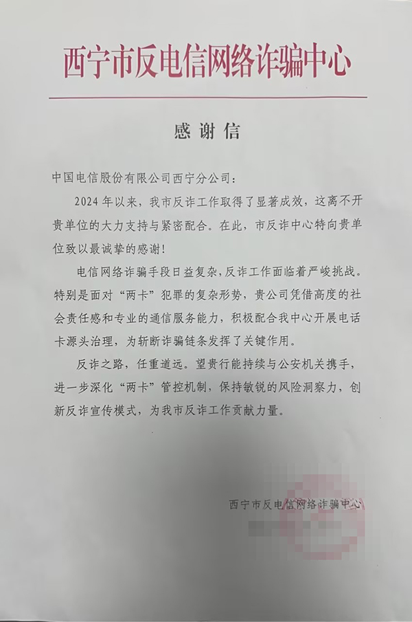 2025年1月8日,西寧市反詐中心為中國(guó)電信西寧分公司送來了一面鮮艷的錦旗和感謝信,錦旗上書“反詐先鋒,履職盡責(zé),警企協(xié)力,再創(chuàng)佳績(jī)”,這份榮譽(yù)的背后,是西寧分公司與市反詐中心攜手共進(jìn)、守護(hù)市民財(cái)產(chǎn)安全的充分認(rèn)可。