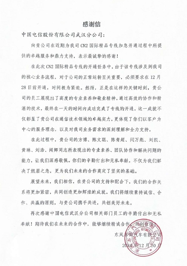 近日,中國(guó)電信湖北武漢分公司憑借高效協(xié)作與專業(yè)技術(shù),成功為東風(fēng)本田汽車有限公司開通了CN2國(guó)際精品專線,贏得了客戶的高度贊譽(yù)。