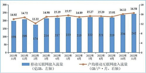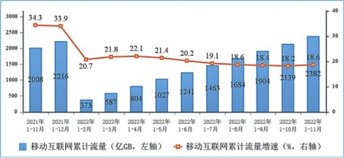 移動互聯(lián)網(wǎng)流量較快增長,當月DOU值再創(chuàng)新高。1—11月,移動互聯(lián)網(wǎng)累計流量達2382億GB,同比增長18.6%。截至11月末,移動互聯(lián)網(wǎng)用戶數(shù)達14.63億,比上年末凈增4702萬戶。11月當月戶均移動互聯(lián)網(wǎng)接入流量(DOU)達到16.58GB/戶·月,同比增長18.3%,比上年底高1.86GB/戶·月。