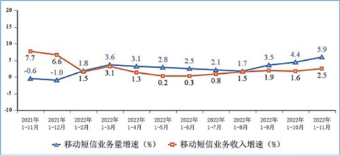 移動電話通話量低速增長,移動短信業(yè)務量增速持續(xù)回升。1—11月,移動電話去話通話時長完成2.1萬億分鐘,同比增長1.2%;固定電話主叫通話時長完成768.6億分鐘,同比下降10%。1—11月,全國移動短信業(yè)務量同比增長5.9%,移動短信業(yè)務收入同比增長2.5%,增速較1—10月分別提升1.5個和0.9個百分點。