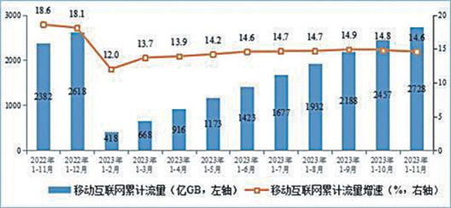 移動(dòng)數(shù)據(jù)流量業(yè)務(wù)收入低速增長(zhǎng)。1—11月,三家基礎(chǔ)電信企業(yè)完成移動(dòng)數(shù)據(jù)流量業(yè)務(wù)收入5918億元,同比增長(zhǎng)0.7%,在電信業(yè)務(wù)收入中占比為38.1%,拉動(dòng)電信業(yè)務(wù)收入增長(zhǎng)0.3個(gè)百分點(diǎn)。