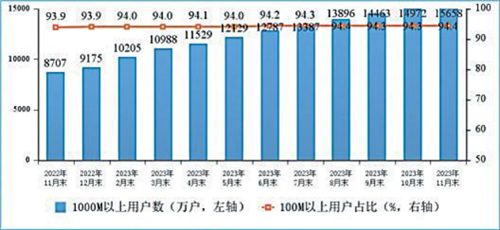 固定寬帶千兆接入用戶占比已近四分之一。截至11月末,三家基礎(chǔ)電信企業(yè)的固定互聯(lián)網(wǎng)寬帶接入用戶總數(shù)達(dá)6.36億戶,比上年末凈增4621萬(wàn)戶。其中,100Mbps及以上接入速率的固定互聯(lián)網(wǎng)寬帶接入用戶達(dá)6億戶,占總用戶數(shù)的94.4%,占比較上年末提升0.5個(gè)百分點(diǎn);1000Mbps及以上接入速率的固定互聯(lián)網(wǎng)寬帶接入用戶達(dá)1.57億戶,比上年末凈增6483萬(wàn)戶,占總用戶數(shù)的24.6%。