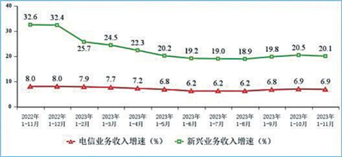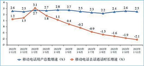 語(yǔ)音和短信業(yè)務(wù)持續(xù)收縮。1—11月,移動(dòng)電話去話通話時(shí)長(zhǎng)完成2.06萬(wàn)億分鐘,同比下降2.1%;固定電話主叫通話時(shí)長(zhǎng)完成736.4億分鐘,同比下降4.2%。1—11月,全國(guó)移動(dòng)短信業(yè)務(wù)量同比增長(zhǎng)0.2%,增速較1—10月回落1.1個(gè)百分點(diǎn);移動(dòng)短信業(yè)務(wù)收入同比下降0.3%,降幅較1—10月收窄0.8個(gè)百分點(diǎn)。
