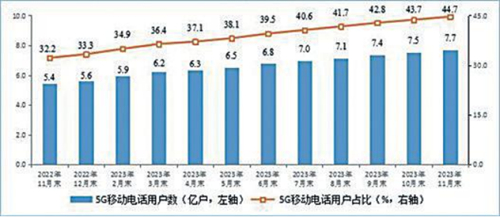 移動(dòng)電話用戶數(shù)穩(wěn)中有增,5G用戶規(guī)模加速擴(kuò)大。截至11月末,三家基礎(chǔ)電信企業(yè)的移動(dòng)電話用戶總數(shù)達(dá)17.26億戶,比上年末凈增4269萬(wàn)戶。其中,5G移動(dòng)電話用戶達(dá)7.71億戶,比上年末凈增21040萬(wàn)戶,占移動(dòng)電話用戶總數(shù)的44.7%,占比較上年末提高11.4個(gè)百分點(diǎn)。