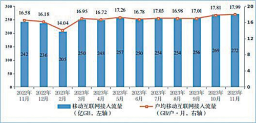 移動(dòng)互聯(lián)網(wǎng)流量較快增長(zhǎng),11月DOU創(chuàng)年內(nèi)新高。1—11月,移動(dòng)互聯(lián)網(wǎng)累計(jì)流量達(dá)2728億GB,同比增長(zhǎng)14.6%。截至11月末,移動(dòng)互聯(lián)網(wǎng)用戶數(shù)達(dá)15.1億戶,比上年末凈增5611萬(wàn)戶。11月當(dāng)月戶均移動(dòng)互聯(lián)網(wǎng)接入流量(DOU)達(dá)到17.99GB/戶·月,同比增長(zhǎng)8.5%,較上年12月高1.81GB/戶·月。