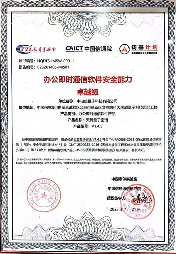 中電信量子集團推出的琨騰密碼服務(wù)管理平臺(密碼模塊)、量子隨機數(shù)生成器、量子加密通話平臺等“通話+量子”產(chǎn)品已獲行業(yè)標準認證。