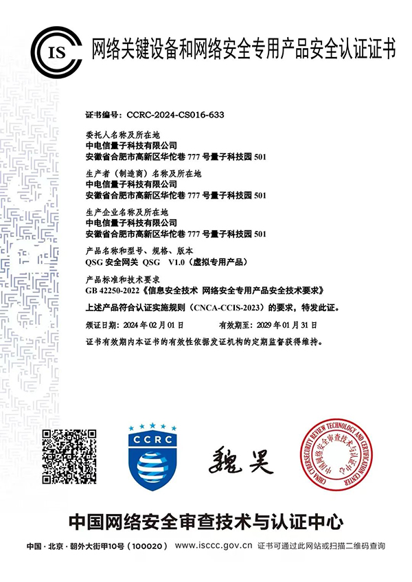 另外,中電信量子集團“網(wǎng)+量子”產(chǎn)品——量子安全網(wǎng)關(guān)現(xiàn)已獲得網(wǎng)絡(luò)關(guān)鍵設(shè)備和網(wǎng)絡(luò)安全專用產(chǎn)品安全認證證書。