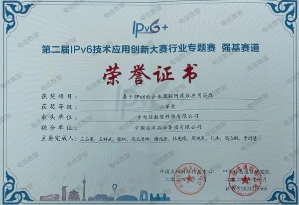 中電信數(shù)智科技有限公司和中國海洋石油集團有限公司聯(lián)合申報的“基于IPv6的企業(yè)互聯(lián)網(wǎng)收斂應用實踐”,榮獲“第二屆IPv6技術應用創(chuàng)新大賽”強基賽道二等獎;中電信數(shù)智科技有限公司(以下簡稱“電信數(shù)智”)、中國電信股份有限公司全渠道運營中心和中國電信集團衛(wèi)星通信有限公司聯(lián)合申報的“IPv6智慧運營平臺”,榮獲“第二屆IPv6技術應用創(chuàng)新大賽”強基賽道最佳實踐獎。