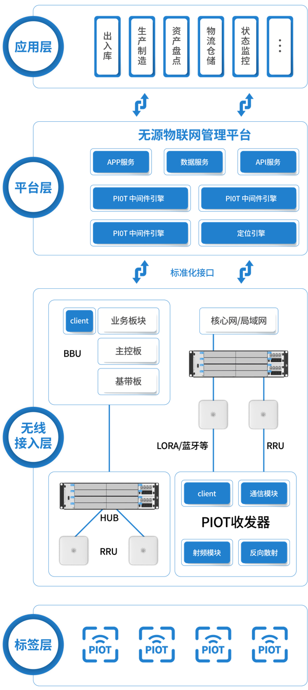 其中,平臺層方面,打造無源物聯(lián)網(wǎng)管理平臺,提供信息模型、數(shù)據(jù)存儲與管理、數(shù)據(jù)分析、數(shù)據(jù)融合、數(shù)據(jù)接口、數(shù)據(jù)交互、中間件等功能,通過開放API接口,為上層應(yīng)用提供資產(chǎn)盤點、感知和定位等服務(wù),實現(xiàn)海量物資的自動化、智能化管理;同時,創(chuàng)新突破無源物聯(lián)網(wǎng)與5G專網(wǎng)融合,提升無源物聯(lián)網(wǎng)在傳輸距離、接入管理和定位精度等方面的能力,支持蜂窩/非蜂窩多種數(shù)據(jù)回傳方式,解決傳統(tǒng)通信系統(tǒng)在復(fù)雜環(huán)境能耗高、成本高、維護難、通信距離短的問題,滿足工業(yè)制造、能源等行業(yè)的需求。