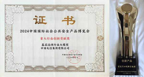 10月22日,第十七屆中國(guó)國(guó)際社會(huì)公共安全產(chǎn)品博覽會(huì)在北京舉行。展會(huì)期間,在由中國(guó)安全防范產(chǎn)品行業(yè)協(xié)會(huì)組織的第九屆優(yōu)秀創(chuàng)新產(chǎn)品頒獎(jiǎng)儀式上,中國(guó)電信自主研發(fā)的“基層治理行業(yè)大模型”榮獲2024中國(guó)國(guó)際社會(huì)公共安全產(chǎn)品博覽會(huì)“重大行業(yè)創(chuàng)新貢獻(xiàn)獎(jiǎng)”。