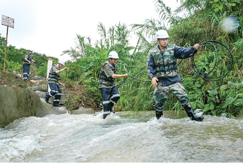 福州電信搶修人員在雨中布設(shè)應(yīng)急光纜。