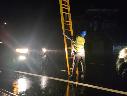 瀘州電信搶險隊(duì)伍冒雨出擊開展故障搶修工作。