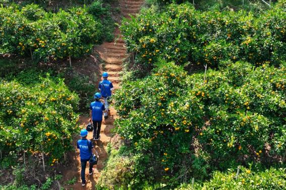 2、在武平縣,為助力“新農(nóng)人”種植的近1000畝特早熟蜜橘與早熟臍橙橘直播賣貨,電信員工加強(qiáng)橘園通信網(wǎng)絡(luò)覆蓋。