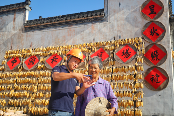 4、中國電信黃山分公司在呈坎村進(jìn)行5G網(wǎng)絡(luò)優(yōu)化工作,助力村民通過直播的方式銷售農(nóng)產(chǎn)品。圖為中國電信黃山分公司裝維人員正在幫助當(dāng)?shù)卮迕裢ㄟ^5G網(wǎng)絡(luò)與遠(yuǎn)在外地的子女視頻分享豐收的喜悅。