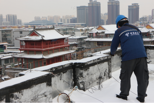 6、近日,一場罕見的暴雪、寒潮天氣侵襲山東德州,氣象部門連續(xù)發(fā)布紅色、橙色預警。為了確保網(wǎng)絡(luò)通信暢通安全,中國電信德州公司第一時間啟動應(yīng)急方案,迅速集結(jié)網(wǎng)絡(luò)條線員工開展抗暴雪保通信工作。室外溫度零下,維護人員頂著冰雪,冒著寒風,拉光纜、調(diào)設(shè)備、快速搶通故障;裝維小哥迅速對斷點快速修復,全力做好通信保障工作,為用戶網(wǎng)絡(luò)暢通撐起保護傘。寒風暴雪不止步,逆雪前行保通信,電信人以實際行動踐行責任與擔當。