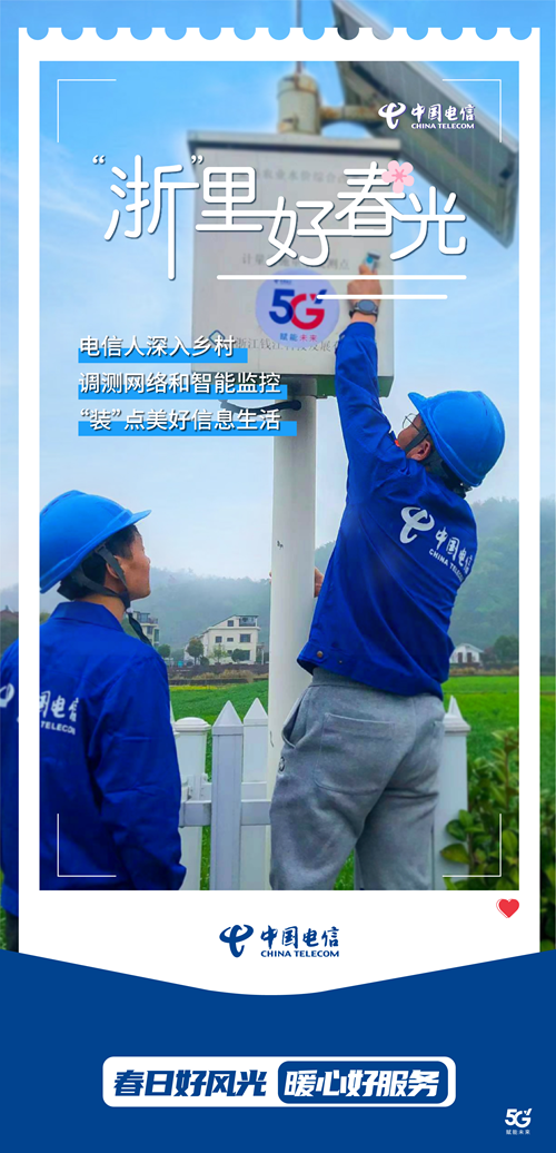 楊柳青青江水平,浙江春色滿城隅。在這春意盎然的時(shí)節(jié),中國(guó)電信浙江分公司深入鄉(xiāng)村,安裝和維護(hù)智能應(yīng)用,為廣大用戶“裝”點(diǎn)美好信息生活。愿我們的5G網(wǎng)絡(luò),如春風(fēng)拂面,讓您隨時(shí)分享生活的點(diǎn)滴,暢享春日好風(fēng)光。