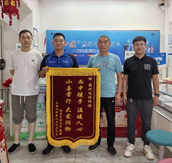 8月22日,中國電信河北廊坊霸州分公司收到一面錦旗,錦旗上"雨中援手,溫暖人心,小善常行,大愛潤物"的金色大字熠熠生輝,它不僅承載著對智家工程師付朋遠的深深感激,更是對電信公司全體員工良好品德的高度認可。