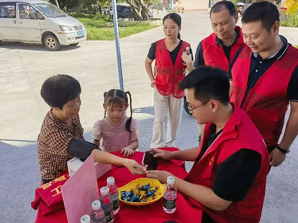 中國電信揭陽分公司志愿者在公益便民服務(wù)活動現(xiàn)場為老年人測量血壓,提升他們的健康意識。