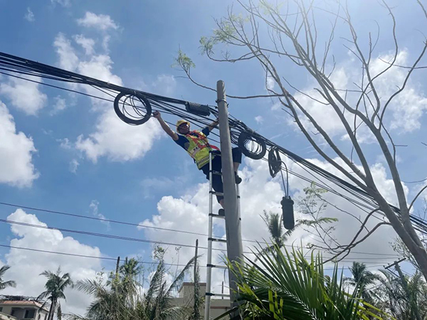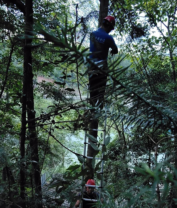 中國電信肇慶四會分公司客響維護(hù)部黨支部突擊隊隊員對通信光纜進(jìn)行升高操作。