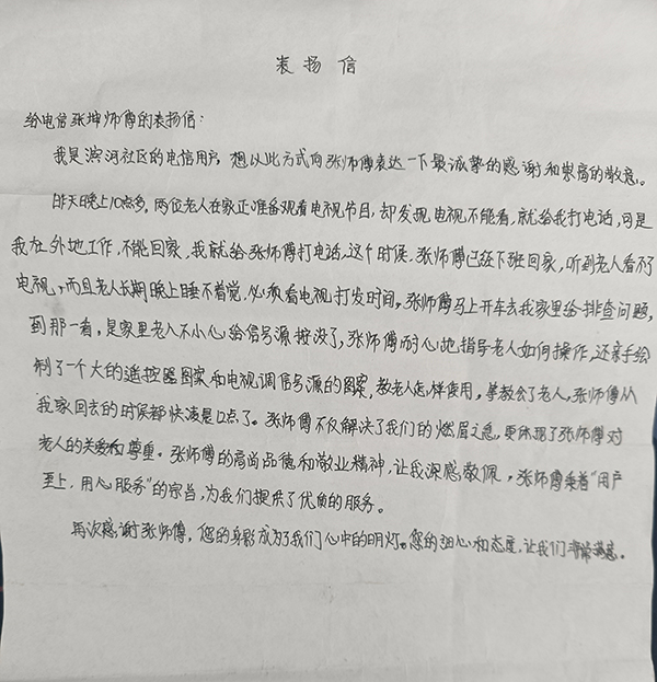 近日,中國(guó)電信河北唐山分公司智家工程師張坤收到一封用戶(hù)送來(lái)的表?yè)P(yáng)信,感謝其夜間上門(mén)為老人處理電視故障。
