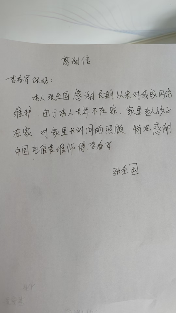 近日,河北省承德市的電信用戶張全國,在歸家探望親人之際,親筆撰寫了一段滿載深情的感謝辭,以此深切表達對中國電信裝維師傅李春軍的由衷謝意。這份感激之情,不僅源自于李春軍長期以來對其家庭網(wǎng)絡(luò)無微不至的維護,更在于中國電信“天翼看家”服務(wù)為其家庭帶來的安心與便捷,同時,它也映射出中國電信在助力鄉(xiāng)村振興進程中的積極貢獻與正面形象。