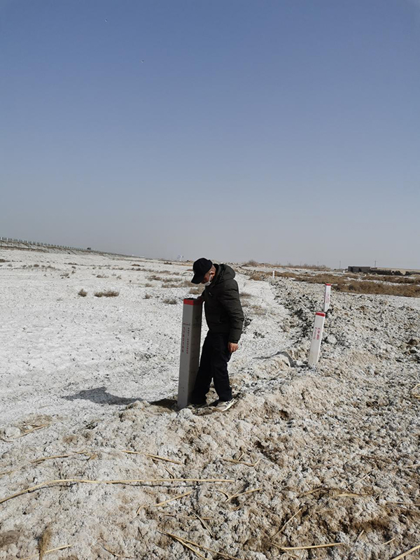 中國電信新疆長途傳輸局庫爾勒分局哈斯木江·再尼丁正在徒步巡檢光纜,增埋標石
