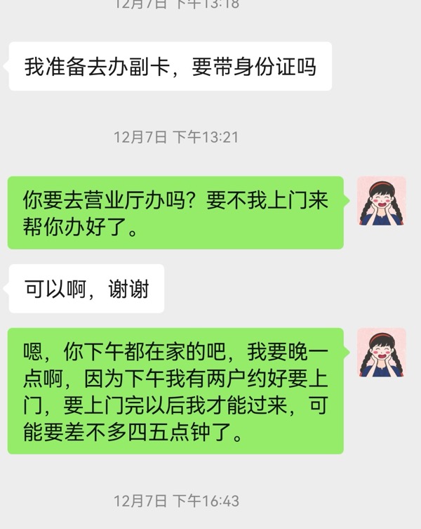 時(shí)間轉(zhuǎn)眼到了12月中旬,陳女士通過微信向吳燕咨詢營業(yè)廳的下班時(shí)間及要不要帶身份證辦理業(yè)務(wù),她想要為大兒子辦理一張副卡用于電話手表,但是她要照顧剛出生的寶寶,所以可能在白天無法出門。了解情況后,吳燕看了看外面被風(fēng)卷起的落葉,覺得為人母不易,何況天氣如此寒冷,她當(dāng)即決定下班后親自上門為其辦理。