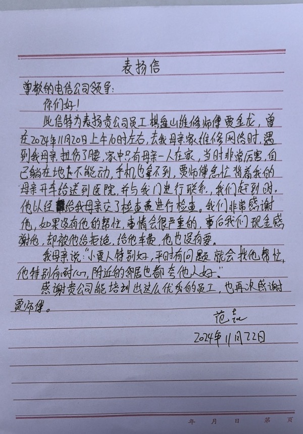 近日,中國電信圍場分公司收到了一封來自用戶的表揚(yáng)信,信中高度贊揚(yáng)了智家工程師賈金龍在緊急情況下的英勇行為和貼心服務(wù)。
