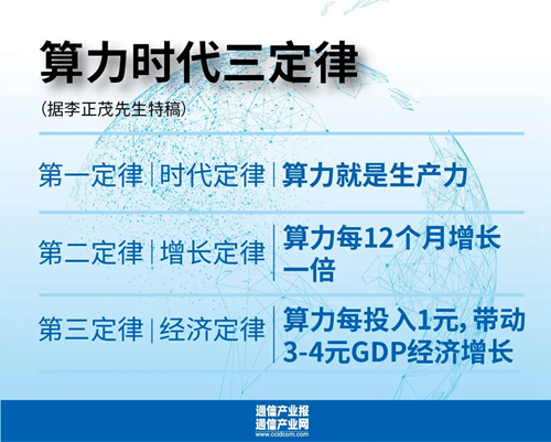 可以預(yù)見,在算力多樣化、網(wǎng)絡(luò)化、智能化、綠色化、安全化等發(fā)展趨勢下,數(shù)字信息基礎(chǔ)設(shè)施將進(jìn)一步演變成為高速泛在、天地一體、云網(wǎng)融合、智能敏捷、綠色低碳、安全可控的智能化綜合性數(shù)字信息基礎(chǔ)設(shè)施,為數(shù)字經(jīng)濟(jì)健康發(fā)展提供堅實底座。整體上而言,我預(yù)計到2050年,算力的發(fā)展正在并且將長期呈現(xiàn)三個趨勢,可謂之為“算力三定律”。