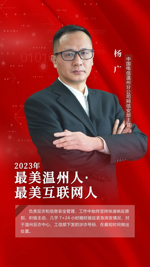 日前,溫州市啟動2023年“最美溫州人·最美互聯(lián)網(wǎng)人”尋訪宣傳活動,經(jīng)過各縣(市、區(qū))和相關(guān)單位推薦申報、資格審查、初評、網(wǎng)絡(luò)助力、綜合終評等環(huán)節(jié),最終評選出10名“最美溫州人·最美互聯(lián)網(wǎng)人”,中國電信溫州分公司網(wǎng)信安部主管楊廣,榜上有名。