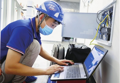 中國電信四川公司裝維工程師為用戶安裝寬帶。