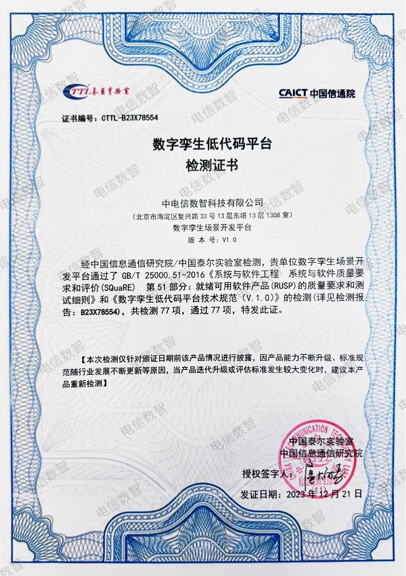 2023年12月27日,中國信息通信研究院(下文簡稱“中國信通院”)主辦的“2024中國信通院ICT深度觀察報(bào)告會(huì)”上頒布了數(shù)字孿生低代碼測評(píng)結(jié)果,中電信數(shù)智科技有限公司(下文簡稱“電信數(shù)智”)的“數(shù)字孿生場景開發(fā)平臺(tái)”產(chǎn)品順利通過77項(xiàng)測評(píng)項(xiàng),獲得中國信通院檢測認(rèn)證證書。