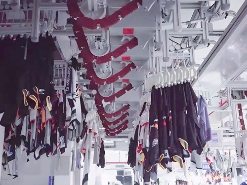 在鵬泰服飾的智能化生產車間里,一卷布匹只需2分鐘即可通過AI智能質檢進入產線。經過熱升華加工后,在1分鐘內完成自動裁片進入下一道工序。運作不停的智能吊掛系統(tǒng)自動排產、動態(tài)派工,將不同款但同版同工藝的訂單聚合在一起,按照生產工序派單給工人制作。這一套布匹變身成衣的過程,高效而精準,減少了人員的奔波,消除了中間環(huán)節(jié)的上下料、儲存和搬運,生產速度和生產效率得到大大提高,小單規(guī)模生產的成本和效率也得到了平衡。