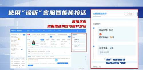 此次上線運營的客戶服務(wù)智能體取名為“諦聽”,與以往的“智能話中助理”只能協(xié)助客服人員簡單地選場景、調(diào)取知識庫不同,“諦聽”智能體具備理解、規(guī)劃、調(diào)度、反饋綜合能力,能夠處理復(fù)雜的查詢,理解自然語言,并自主執(zhí)行任務(wù),幫助用戶確認(rèn)報障號碼、報障地址以及身份證等實名認(rèn)證信息,還會結(jié)合客戶的意圖、基礎(chǔ)資料、多維標(biāo)簽自動適配服務(wù)方案,自動調(diào)用周邊IT系統(tǒng)、業(yè)務(wù)平臺的原子能力排除故障,并自動反饋排障結(jié)果。