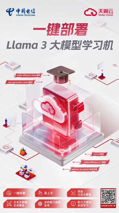 為了方便廣大AI技術愛好者與從業(yè)者快速上手學習與使用大語言模型技術,天翼云基于開源的Meta-Llama-3-8B-Instruct模型以及text-generation-webui框架,搭建了一鍵部署、開箱即用的云主機鏡像。同時,天翼云CPU/GPU云主機近期即將上線Llama 3大模型學習機,期望能夠成為幫助用戶打開大模型領域之門的第一把鑰匙,讓更多用戶從此了解大模型、學習使用大模型,并利用大模型創(chuàng)造更多可能。