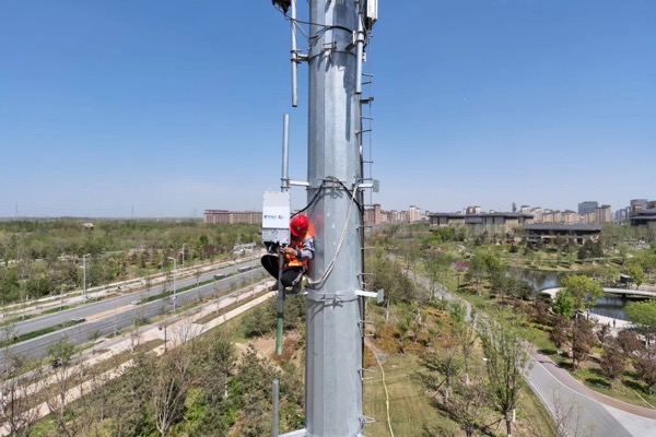 圖為網(wǎng)絡(luò)建設(shè)工程師在雄安新區(qū)悅?cè)莨珗@進(jìn)行通感設(shè)備安裝