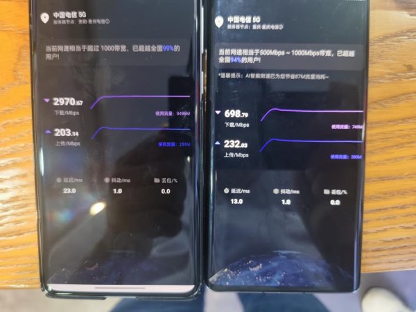中國電信5G下載速率演示,左圖為5GA,右圖為普通5G