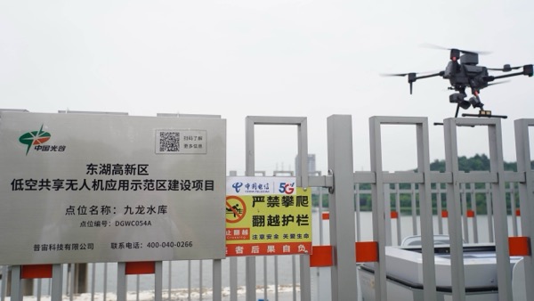 6月13日,在武漢九龍水庫,有架無人機如同一顆明亮的星星,在空中閃爍著光芒?!八軐崿F全自動水利巡邏,任務過程中能利用5G-A通感算一體技術實時感知周圍環(huán)境,精準定位自身位置,與地面控制中心保持高速、低時延的通信,這種安全、高效、智能的現代科技化的手段有效提升了提高飛行效率和任務完成率?!痹诘孛婵刂浦行模ぷ魅藛T邊通過屏幕觀察著無人機的飛行軌跡和實時數據邊介紹?!巴瑫r它還能監(jiān)測處置違法垂釣,違法排污等現場,進一步提升產城融合發(fā)展水平、帶動城市治理轉型、提升市民生活質量?!?/p>