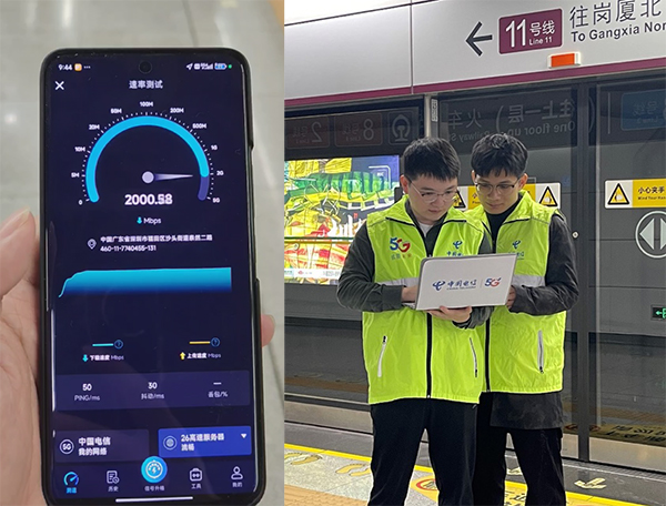 據(jù)了解,此次5G改造專(zhuān)項(xiàng)行動(dòng)中,11號(hào)線(xiàn)隧道及站臺(tái)區(qū)域各新增5G 300M寬帶速率,相較于4G帶寬提升8倍,全面解決高峰期網(wǎng)絡(luò)擁堵問(wèn)題,高效支持高清視頻、手游和遠(yuǎn)程辦公等高流量應(yīng)用需求。此外,全線(xiàn)引入5G-A 3CC組網(wǎng)技術(shù),用戶(hù)平均下載速率較改造前提升至20倍,峰值速率突破2Gbps。在信號(hào)覆蓋方面,改造后,5G-A信號(hào)覆蓋范圍延伸至站臺(tái)、隧道及車(chē)廂,深圳電信網(wǎng)優(yōu)工程師開(kāi)展了多輪現(xiàn)場(chǎng)測(cè)試優(yōu)化工作,確保高品質(zhì)網(wǎng)絡(luò)連續(xù)可用。