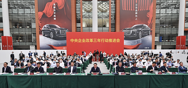 在國企改革三年行動時間過半的關(guān)鍵節(jié)點,6月4日,國務(wù)院國資委在中國一汽以“現(xiàn)場+視頻”形式召開中央企業(yè)改革三年行動推進會,總結(jié)工作成效,推廣改革經(jīng)驗,以典型示范帶動改革深化。國務(wù)院國資委黨委書記、主任,國資委全面深化改革領(lǐng)導(dǎo)小組組長郝鵬出席會議并講話強調(diào),要深入學(xué)習(xí)貫徹習(xí)近平總書記重要指示精神,貫徹落實黨中央、國務(wù)院決策部署,搶抓寶貴時間窗口、珍惜有利條件形勢,真抓實干、銳意進取,進一步抓緊抓實改革三年行動,更好促進中央企業(yè)高質(zhì)量發(fā)展,加快建設(shè)世界一流企業(yè),為全面建設(shè)社會主義現(xiàn)代化國家作出更大貢獻。國務(wù)院國資委黨委委員、副主任翁杰明主持會議。國務(wù)院國資委黨委委員、副主任任洪斌,黨委委員、秘書長彭華崗出席會議。