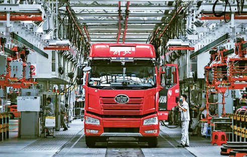 企業(yè)強則國家強,加快建設世界一流企業(yè)是全面建設社會主義現(xiàn)代化國家的重大任務,是新時代國有企業(yè)的戰(zhàn)略目標。近來,一汽解放集團股份有限公司生產(chǎn)按下“加速鍵”。圖為2022年6月15日,工人在位于吉林長春的一汽解放總裝車間內裝配車輛。 新華社記者 許暢/攝